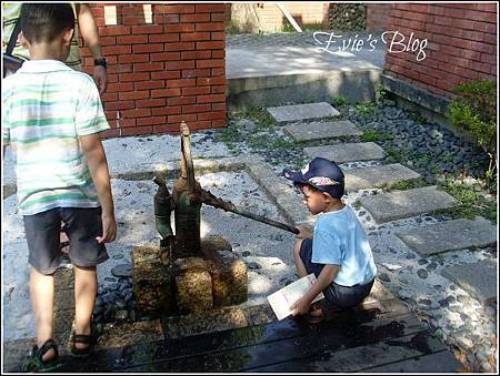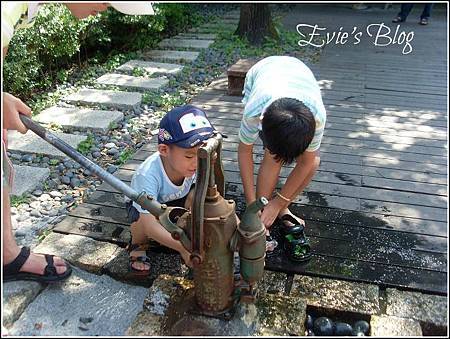 傳統的打水器~一開始兄弟倆不知道這個的用途,經過爸比示範用法,告訴兩兄弟用手握著打水器上的棍子上下壓動,就會有水從水口流出,冰冰涼涼的水讓他們感到非常新奇...